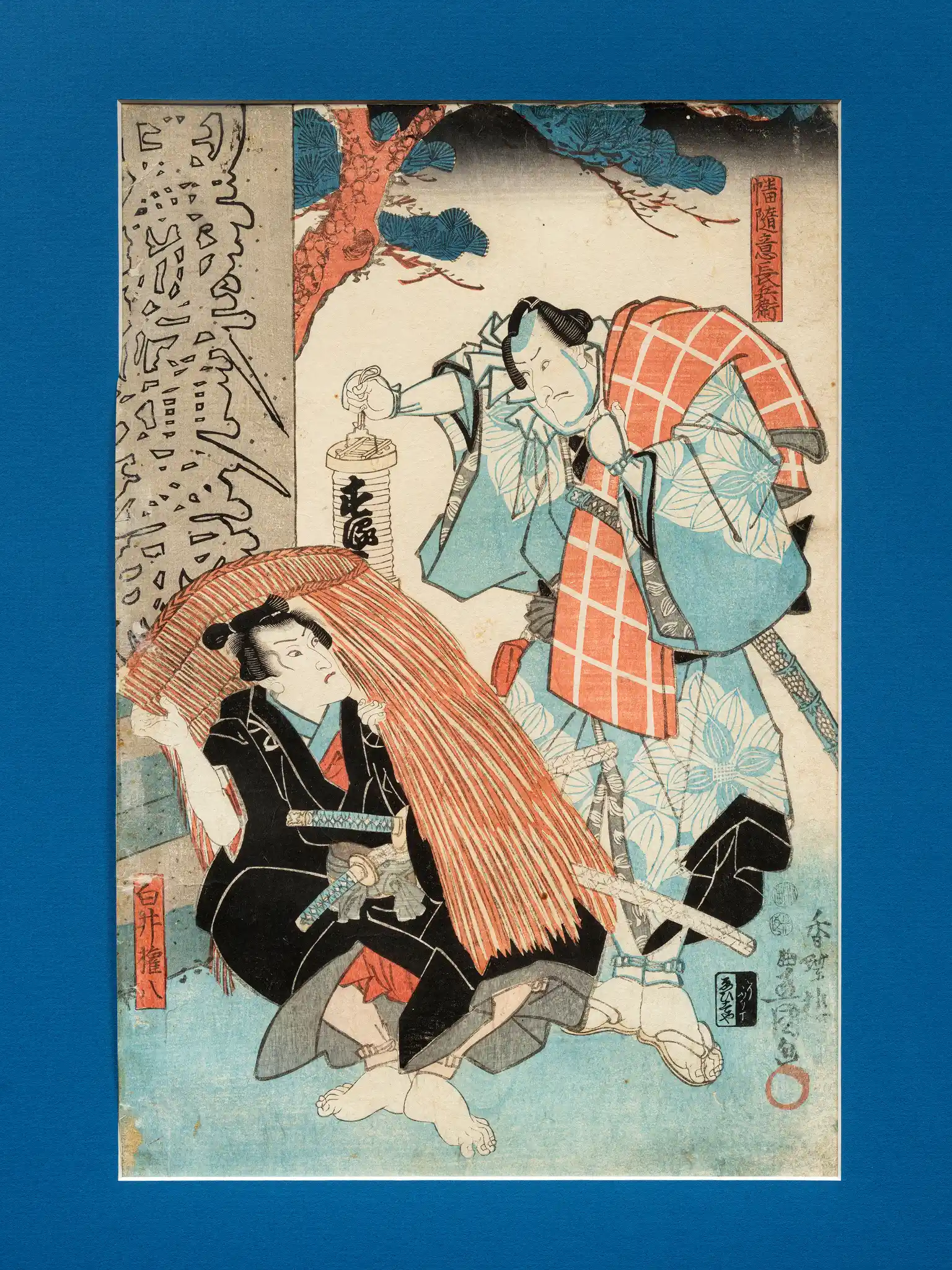 Zwei Schauspieler in der Rolle von Samurai begegnen sich in einer dramatischen Szene unter freiem Himmel. Die Haltung der Figuren, die markanten Gesichtszüge und die differenzierte Gestik folgen den Konventionen des Kabuki-Theaters, in dem Emotion und Handlung durch stilisierte Bewegung vermittelt werden. Kunisada inszeniert die Begegnung in enger Bildanlage, wodurch die Spannung zwischen Nähe und Konfrontation gesteigert wird.